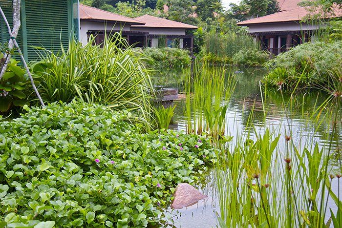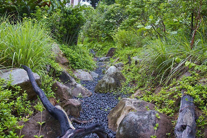 Drip irrigation provides for a landscape surface area of 17, +65 64511922m² at 10mm of water per m² which amounts to 175,83 m³ per application. Water from PUB is only supplemented if rainwater harvesting is insufficient. This system reduces water consumption considerably while disseminating water efficiently to plants throughout the landscape.