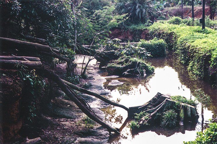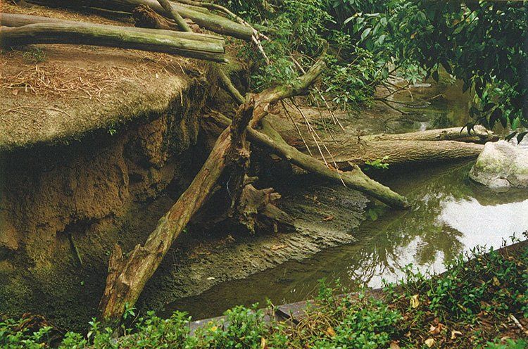Marsh Bird Exhibit, Singapore Night Safari - Eco pond with simulated eroded earth embankment