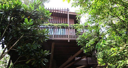 Climbing plants were also planted at the base of the tree lofts to grow over their trunks and render an even more natural look amidst the forest greenery. Additional hanging plants were planted at the second storey decks, for them to cascade down and enhance the green envelope of the lofts.